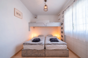You’ll stay in a cozy and functional room with a double bed, bunk beds, a private bathroom, and a large built-in wardrobe offering plenty of storage space.