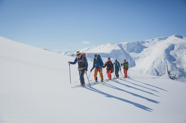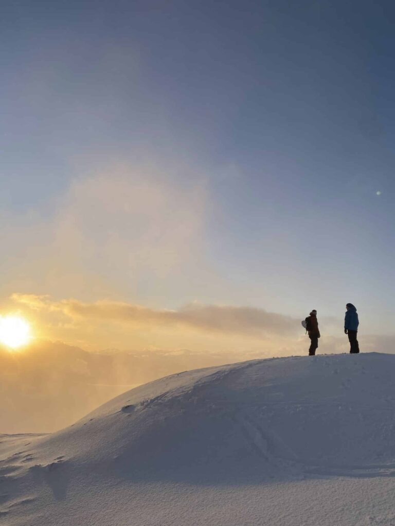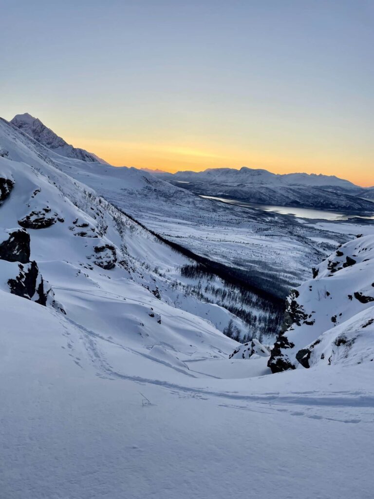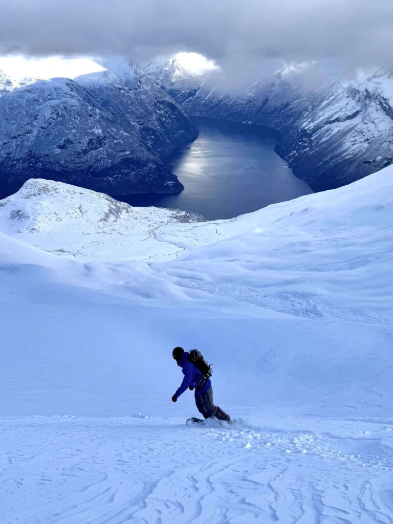 Vi börjar morgonen med frukost på hotellet, gör i ordning vår matsäck och ger oss därefter ut i bergen tillsammans med lokala, certifierade och erfarna guider. Dagarnas upplägg anpassas efter snö, väder och gruppens nivå – så vi får ut det mesta av varje plats. Räkna med stillhet, vidsträckta vyer, bra samtal och långa åk ner mot fjorden.