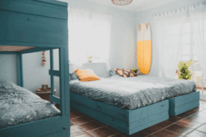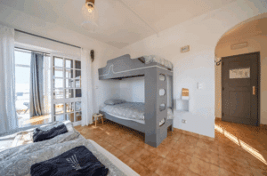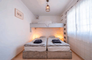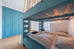 Här får du ett mysigt och funktionellt rum med dubbelsäng, våningssängar, eget badrum samt en stor inbyggd garderob med gott om förvaringsutrymme.